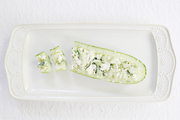 Slice cucumber lengthwise in half. Use a spoon to scoop out seeds to make the "boat." Dice up one half of the cucumber and mix in a bowl with the crumbled feta cheese, dill, and salt and pepper to taste. If desired, cut a small strip off the bottom of one side of the boat so that the half will set level. Fill the boat with the mixture.