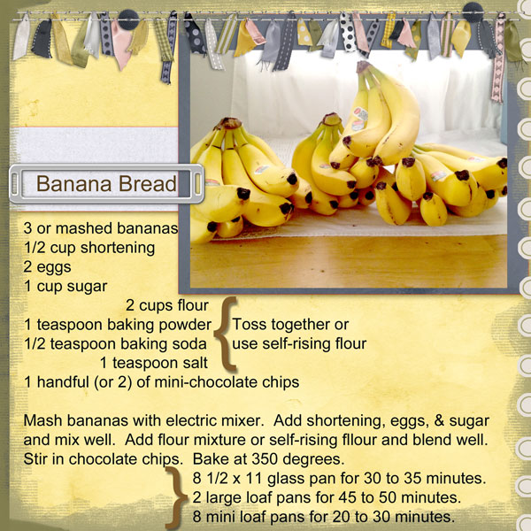 This is a sweet banana bread recipe with chocolate chips. This is not a typical banana bread loaf with nuts (which I like more but never get to make for myself). I find that people either really love or do not care for this recipe.