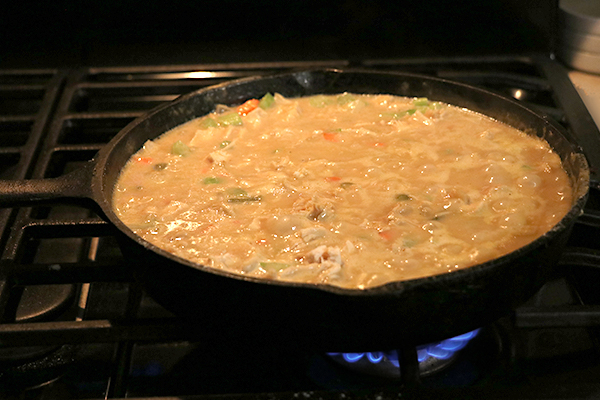 The filling is also so versatile! The chicken pot pie filling is made on the stove top. It is the yummy part! Ah! Once made, instead of putting into a pie crust for baking, it can be poured over rice or any type of potato, or possibly noodles or hot biscuits, or even eaten as is right from the spoon. The possibilities are endless.