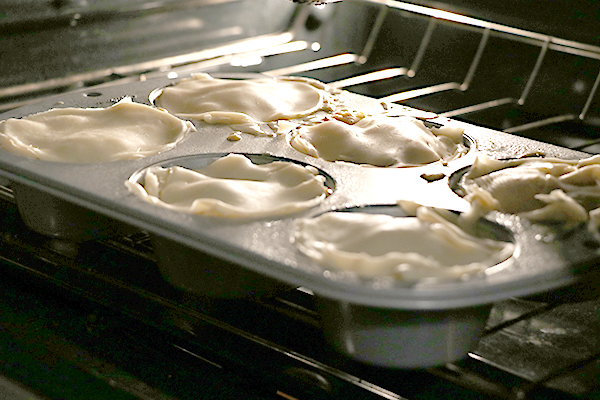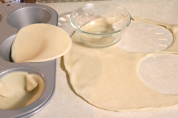 I bought the refrigerated pie dough that rolls out flat. I grabbed a larger and a smaller glass bowl to use as a cutter. The larger glass bowl was not quite large enough to fill the tin cup. I did use some of the scraps to build up the edges or to fill in where there was not enough dough to cut a complete circle. The outcome did not seem to be effected by piecing together parts to cover the cups. I worked in every piece of scrap of the dough somewhere.