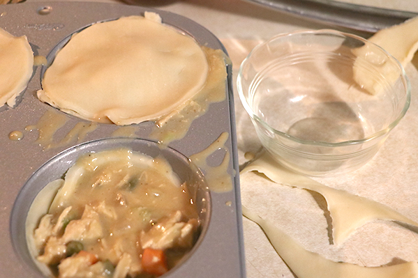 After adding the chicken pot pie filling, I used the smaller glass bowl to cut the tops. It was a perfect fit.