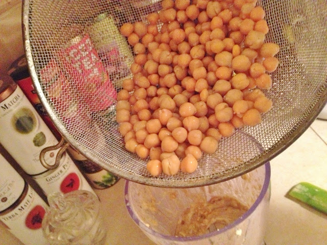 Next, I rinsed the can of garbonzo beans well and added them and blended and scrapped and blended away! I discovered my little blender could not handle it well without some water added, so I added about a 1/4 cup of water and blended some more.