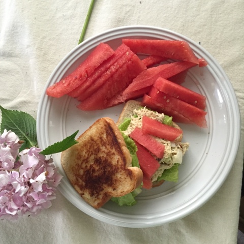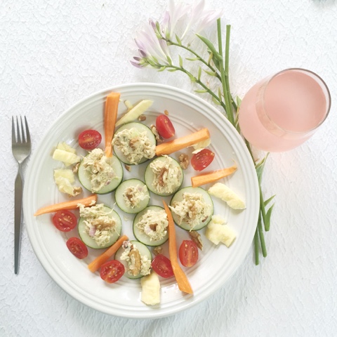 Chicken salad Day 4 fun! How many ways can I make it new? Today it's on cucumber slices topped with walnuts, and carrots, tomatoes, and New Zealand white sharp cheddar cheese. Still drinking the blood orange lemonade I made on Sunday. Cut a few hosta flowers to grace my plate. It's one of those perfect weather days on the patio. #eathealthy