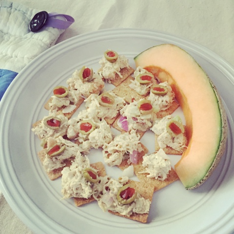 Chicken Salad Day 2 chicken salad -- on wheat thins with sliced olives and cantaloupe--looks kind of weird, but tasted good.