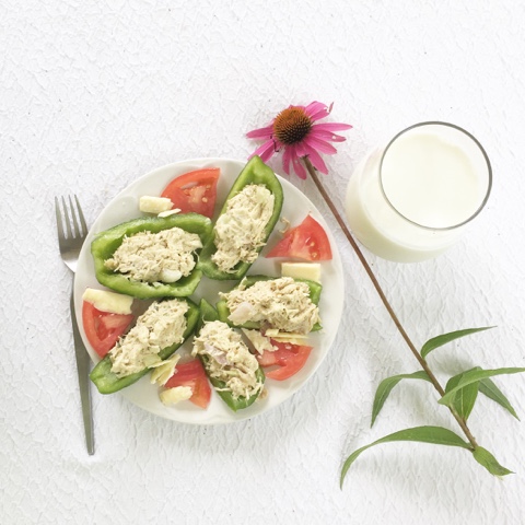 Today's chicken salad foodie fun comes to you on a small plate because someone brought in Krispy Kreme at work! On a green bell pepper, with one slice of tomato and one slice of cheese send a glass of milk and and purple coneflower from the garden and I still have chicken salad left. #frugal #lunchtime #enjoythesimplethings #eathealthy #fatpeopletry