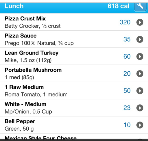 The cheese at the bottom was 100 calories, but my phone couldn't get the complete list on it for a screen shot. My half of the pizza was 618 calories. Wow! Huge meal for me, but probably less than if we had ordered a pizza in, plus, I got the toppings I enjoyed.