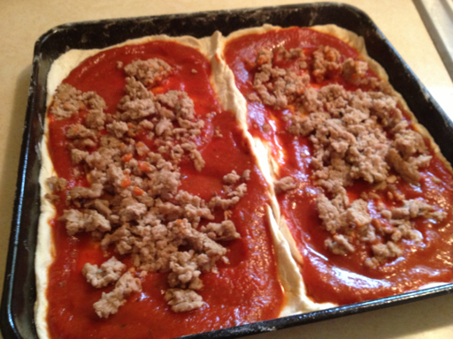 We scrunched up the middle of the dough to keep our sides separated. We added canned pizza sauce and ground turkey (he got about 3/4ths of the turkey).