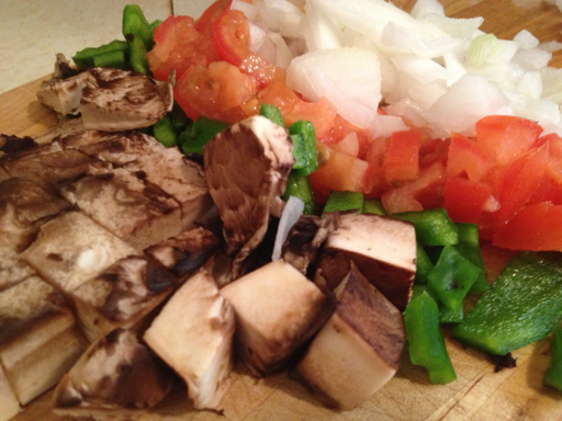 Here are my veggies all chopped on the cutting board, including portabella mushrooms, green pepper, tomato, and onion.