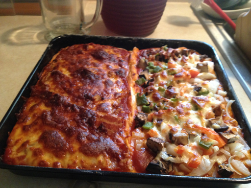 Here it is, straight from the toaster oven after about 15 minutes! I think my side looks much better as the cheese melted between the veggies, while hubby's had no where to go and got a bit toasted.