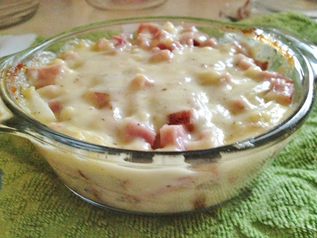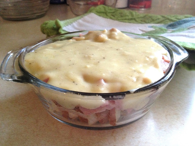 I topped my potatoes, onions, and ham with the cheese sauce in my personal bowl.