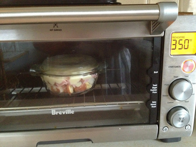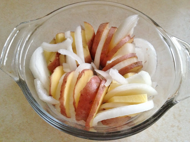 I put the potatoes and onion, cut into slices, in my single serve bowl. Yes, I am learning to cook for one or two.
