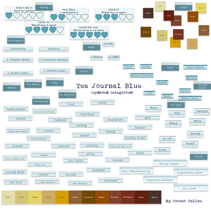 Download my Tea Journaling Blue Kit As I used the below kit, which was the original kit, I discovered that I needed to change some of the categories, eliminate some, and add a lot more. I now exclusively use this new blue kit for my tea journaling in OneNote. However, the first kit could be used interchangeably if you like to mix and match colors.