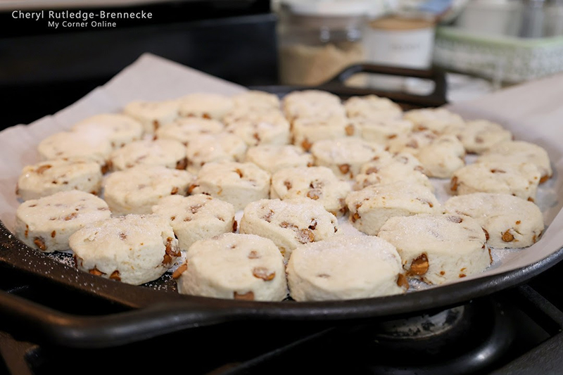 Dump batter onto floured surface and knead until dough forms. Use rolling pin to roll dough into ½ inch thickness. Use 1 inch circle-shaped cutter, cut and place on parchment paper. Keep bringing dough together, rolling, and cutting until all scones have been prepared.