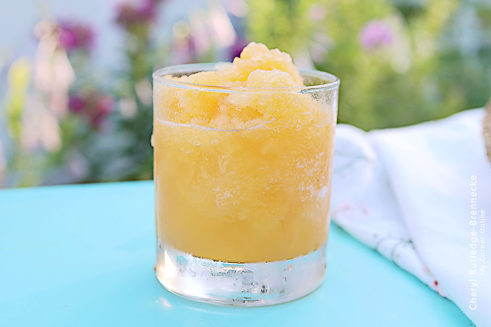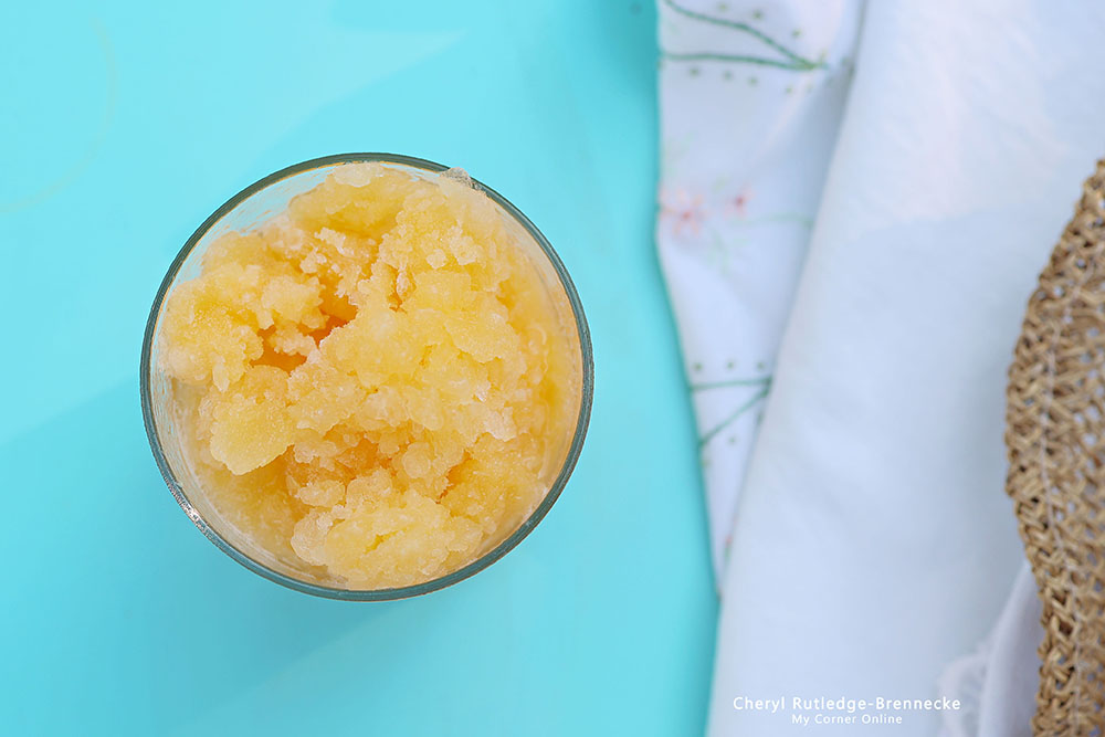 Stir sugar into 2 cups boiling water. When dissolved add jello. When dissolved add all other. Freeze until slush, about 10 hours. Spoon into glasses. I topped it with peach schnapps which is optional, but oh, so good.