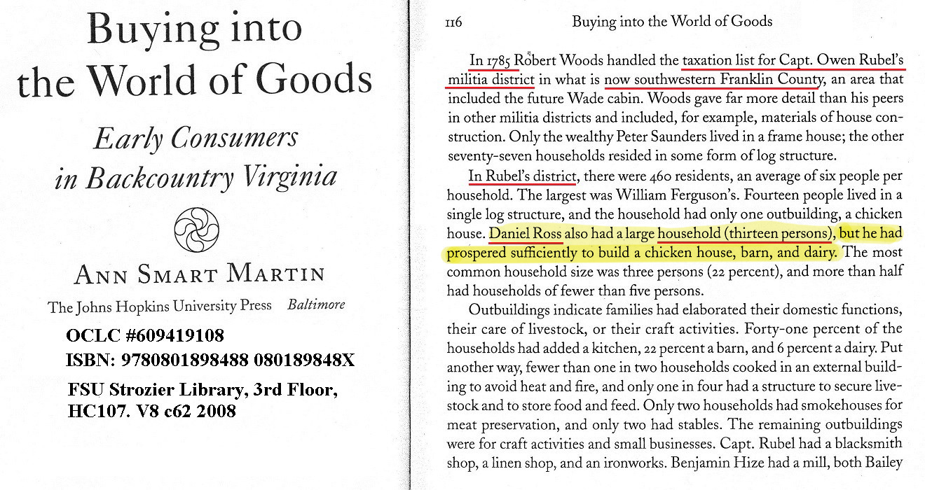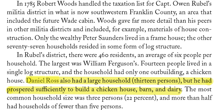 In 1785 . . . . .Daniel Ross also had a large household (thirteen persons), but he had prospered sufficiently to build a chicken house, barn, and dairy...Outbuildings indicated families had elaborated their domestic functions, their care of livestock, and their craft activities . . . 22 percent a barn, and 6 percent a dairy. . . These people continued to live in log dwellings. Google Books,