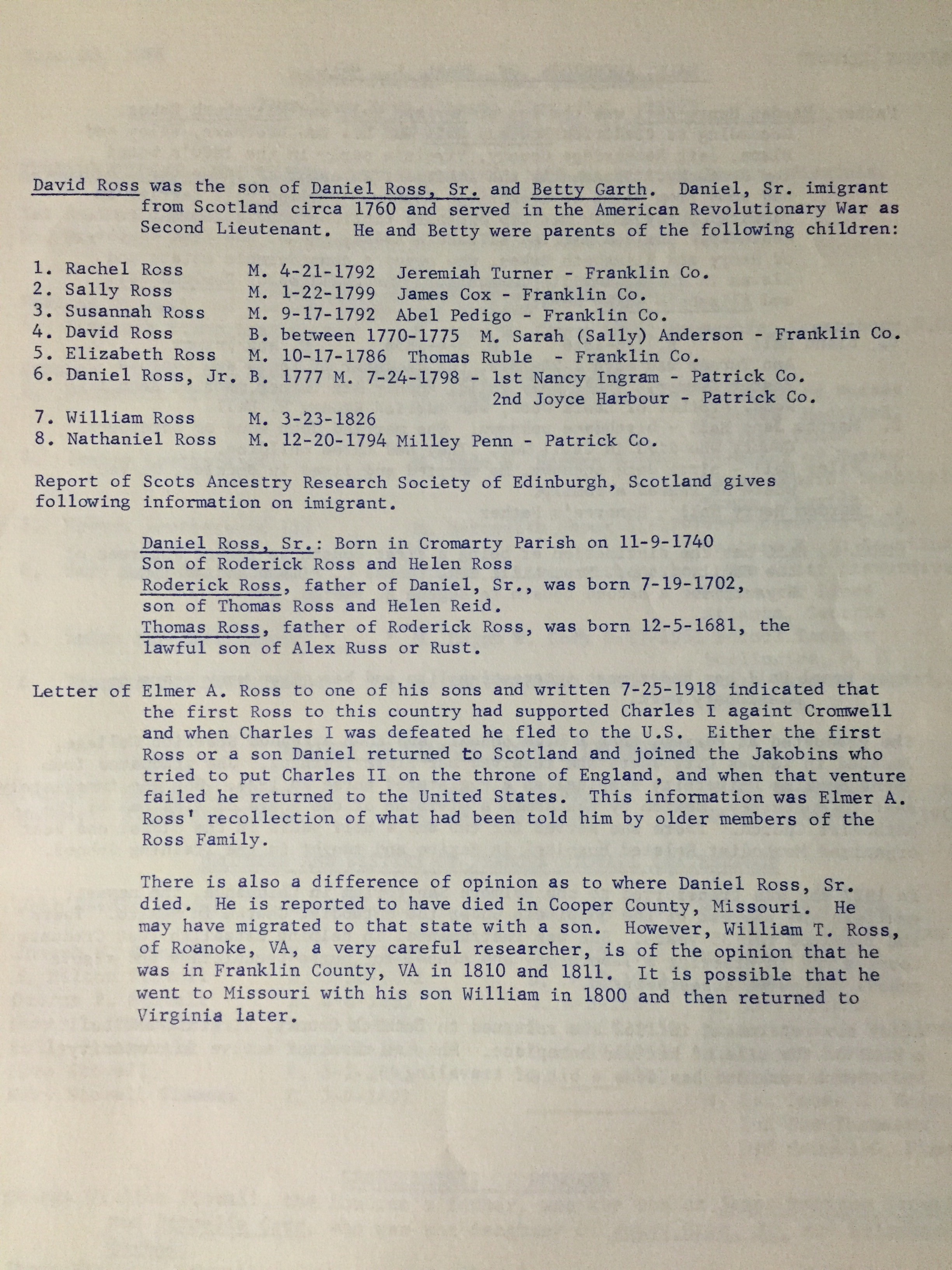 In the book "Harbours in America" by Louis J. Williams, 1982, pages 590-592, it reads, "Three Ross brothers are believed to have migrated from Ross Shire (Rosshire), Scotland to Virginia. Although there are discrepancies as to the names, they are believed to have been Daniel, John and Peter. Daniel Ross settled in Louisa County, part of which later became Albemarle. While he was in Louisa County, he married Elizabeth "Betty" Garth, daughter of John Garth of Trinity Parish, Louisa County. Later he moved to Henry County, Virginia and settled on Smith River. The area of Henry County where Daniel settled later became Franklin County when it was formed in 1785. Exact dates of birth and death of Daniel are not available but it would appear...that he was born about 1740 or earlier. He was living in Franklin Co. as late as 1811 or 1815. He was not on the Census of 1820. He died in Cooper Co, MO. in 1822. There are a number of land transactions in which Daniel participated in Louisa, Franklin and Henry Counties of Virginia.