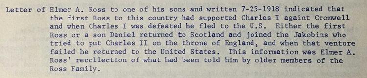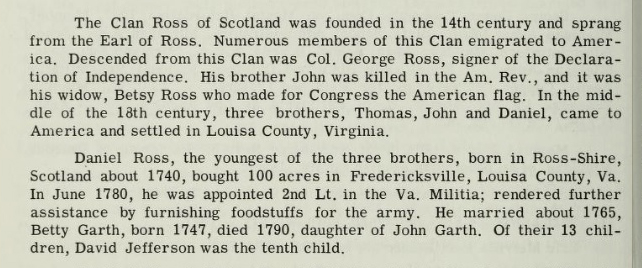 These notes on Daniel's son David Ross were obtained from Ancestry, but I do not know the source. It lists Daniel's Dad as Roderick and his Grandpa as Thomas, as research by the Scots Ansestry Research Society, but no source is given. Elmer A. Ross provides a history of why Daniel Ross came to the Virginia Colony (it was not the United States or America at that time). "The first Ross . . . supported Charles I against Cromwell and when Charles I was defeated he fled to (the colonies). Either the first Ross or a son Daniel returned to Scotland and joined the Jakobins who tried to put Charles II on the throne of England, and when that venture failed he returned to (the colonies).