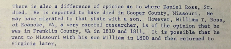 The Ross family has been living in this area since 1776, just before the time when Henry County was formed in January 1777. Daniel Ross, Sr. had moved to Henry County from Amherst where he served in the Henry County militia throughout the Revolutionary War. He was appointed an Ensign, then a 2nd Lieutenant, then a Lieutenant on September 28, 1780. Daniel owned land on both sides of the Smith River, but from deeds and tax records his actual residence was on the north side of the Smith. He lived in the part of Henry County that would split off and become Franklin County in 1786, but some of his land south of the Smith fell into that portion of Henry that would become Patrick County in 1790. Daniel and his wife, Elizabeth Garth through whose family he met and had dealings with Thomas Jefferson, and their family lived in this Henry/Franklin/Patrick area until he, Elizabeth and their son Churchill moved to Henry County, Kentucky in 1811/1812. Some of their children moved to Tennessee, Kentucky and to Cooper County, Missouri where Daniel died and was buried in 1821/1822.