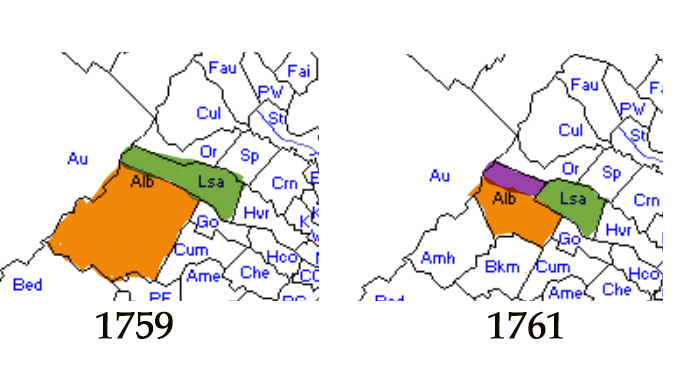 The orange is Albermarle County. The green is Louisa County. The purpose area is the area where Daniel and Betty settled that changed counties.