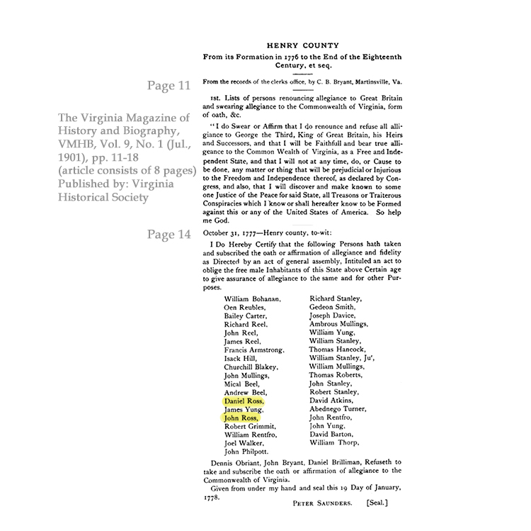 On October 31, 1877, Daniel Ross and his son John were among the men in Henry County who took the oath of allegiance to the Commonwealth of Virginia, rejecting allegiance to the King of Great Britain.