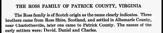 (Names not the same as above book) In the Ross Family of Patrick County, Virginia article in The History of Patrick and Henry Counties, Virginia, it reads, "Three brothers came from Ross Shire, Scotland, and settled in Albemarle County, near Charlottesville, later one came to Patrick County. The names of the early settlers were: David, Daniel, and Charles.