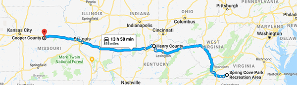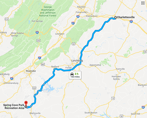 This is a map of today showing a possible route from their home near Charlottesville to near Spring Cove Park Recreational Area.