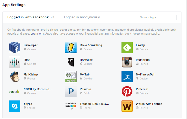 Whenever I use an app on my smart phone, it asks me to connect to various social networking sites, most often to hook up with friends, to post to my Facebook page, and sometimes just to use it as a log in. Sometimes I want this, but sometimes when I stop using an app, I should remember to revoke access of it to my accounts. This is a screen shot of what is left of my apps after I revoked access to many things. In fact, I may remove some more of these. You will note there were originally 49 accounts! I was shocked!