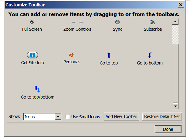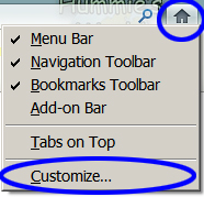 To add icons to the toolbar, right click on the little "home" icon on the right side of the navigation toolbar. Click "Customize."