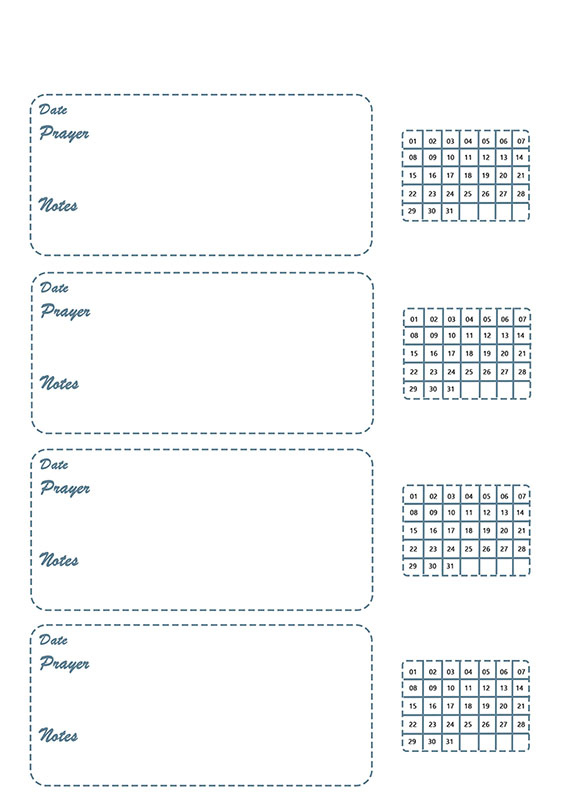 What I created gives space to write the prayer request, to add notes as the request changes or praises for answers arise, and the provides a simple monthly calender to color in the space for that date of the month when I prayed for that prayer request. If prayer requests last longer than a month, I will need to rewrite the request on a new page.