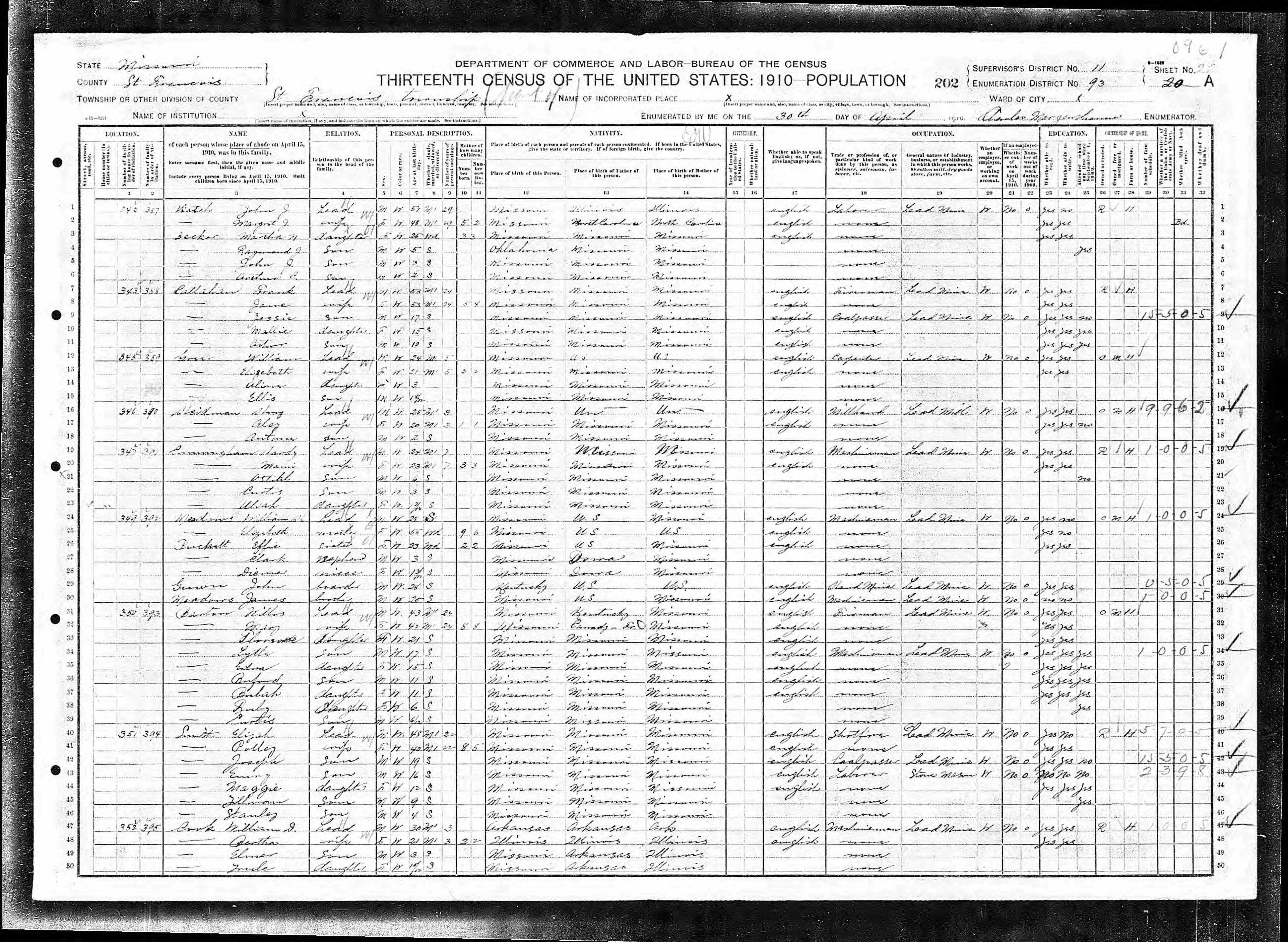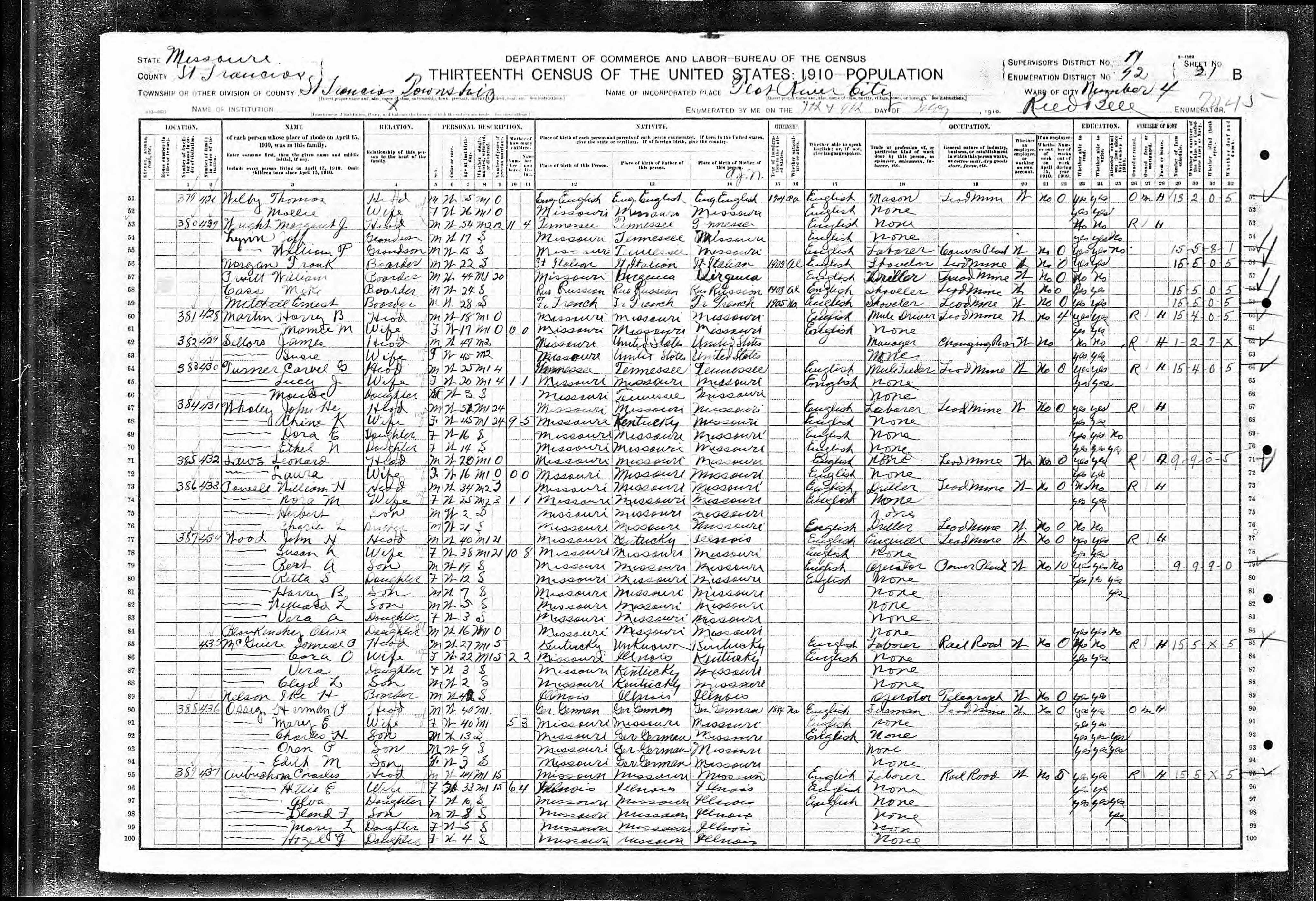 Where is Thomas in the 1910 census? His wife, Margaret, is in the 1910 census St. Francis Township, St. Francois County, City of Flat River, Missouri, District 92 (sheet 21). Margaret is 54 years old and married for 12 years. If she is still married, where is Thomas? This is an indication that Thomas is alive in 1910. Margaret is living with two grandsons, children of her son Perry Lynn from her first marriage, Jeff Lynn (age 17) and Willilam P. Lynn (age 15). There are four boarders in the house, that being Frank Morgan, William Pruitt, Mike Cass, and Ernest Mitchell. Boarders were often miners in the lead mines. In the 1910 census, Thomas's son, James William, is 16 and continuing to live with his brother, Daniel Boone Wright, where the family resided in Caledonia. Caledonia and Flat River are approximately 19 miles apart. In the 1910 census, Thomas's daughter, Aley, is living with her husband in St. Francis Township, District 93 (noting Margaret is in District 92). In the 1910 census, Thomas's daughter Jesse (age 16) is living as a servant (cook, boarding house) in St. Francois Township District 92 (Flat River City), the same district as Margaret, but on sheet 16. Find 1910 census for son John R.