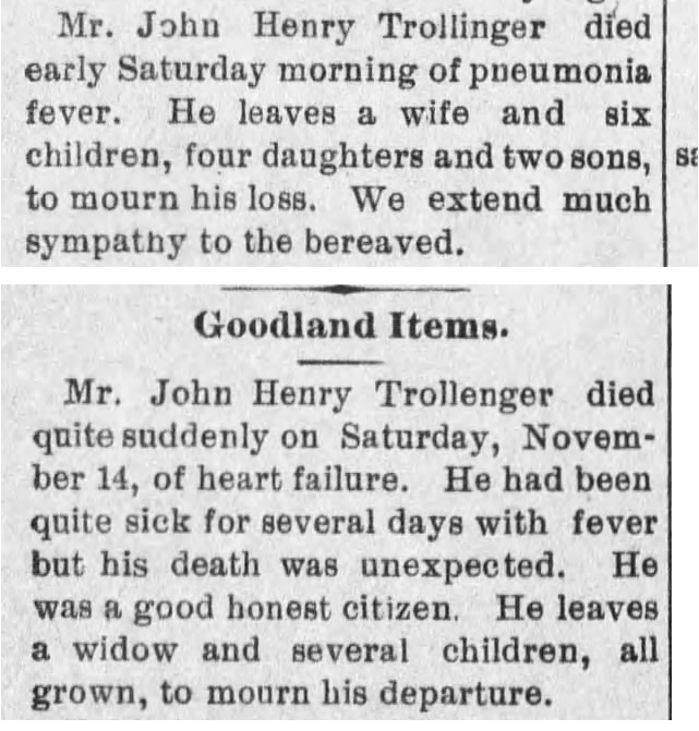 Grandpa’s line: Joseph Kirkpatrick Jr married Margaret Trollinger, whose Father is Absolum Trollinger (b. 1819) and sister is Lucinda Trollinger.