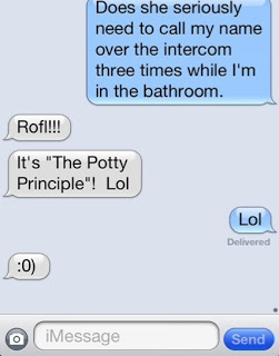 This is a text conversation I had with my hubby yesterday. Every time I get up from my desk at work to go to the bathroom, THAT's when someone calls me! I can sit there for hours without a call, but when I get up, that's when someone calls me.