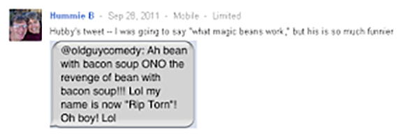 I just had to share this post that I put on Google Plus here (to archive it as I removed it from G+). It makes me laugh today! "Ah bean with bacon soup! The revenge of bean with bacon soup!! lol my name is now "Rip Torn"! Oh boy! lol