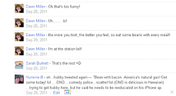 "O that's too funny! "uh...lol" The more your toot; the better you feel, so eat some beans with every meal!" "Im at the station lol" "That's the rest!"